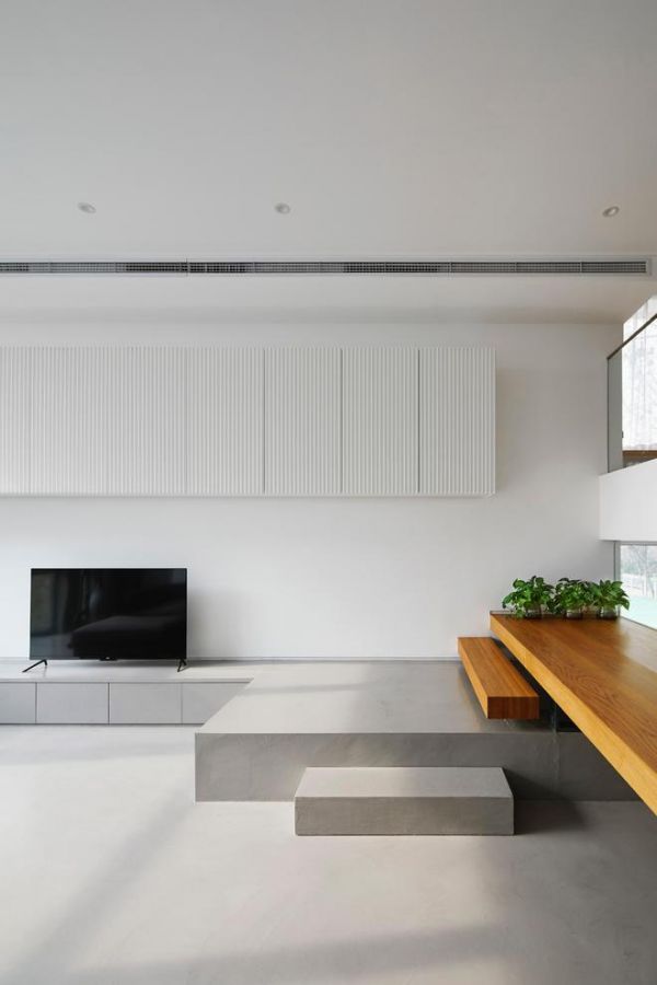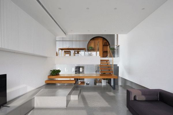 这样的设计手法不仅引入更多采光,“半层客厅”更成为空间递进关系中的关键性存在。从楼梯结构延伸出的木质小平台,既承接着楼梯的上下行功能,又可作为开放书桌进行使用,满足孩子们日常学习、阅读的需求;沿楼梯踏步向下,则来到微水泥大平台,这里的面积更为开阔,除了传统的沙发、电视等日常居家配置外,也是主人们日常运动、健身的区域。站在“半层客厅”,借由平台的高度特点,家人可以轻松的看到一层餐厅、厨房,以及二楼的茶室,让成员之间自然而然的关注到对方的动态,在视觉的影响与引导下,巧妙回应了屋主对“温度感”的需求。