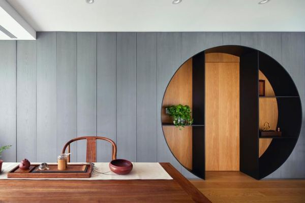 客厅之上则是另一番景象,顺着木质楼梯向上走去,一个专为女主人布置的茶空间,充满了东方意境。茶席背后的圆形月亮门,取于传统园林造景的手法,它是优雅的多宝阁陈列架,也藏着通往长辈客房的一道暗门,独特而静谧。