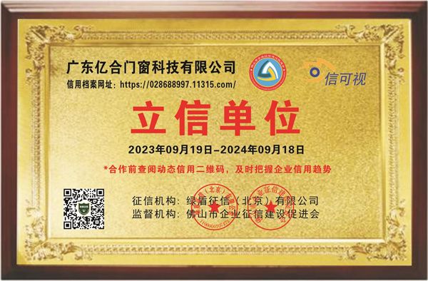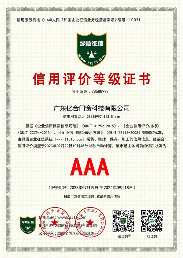 亿合门窗此次荣获“3A级信用等级”认证,不仅是对其过去诚信经营的肯定,更是为其未来发展提供了强有力的信誉证明和支撑。这一荣誉将为亿合门窗带来更多的商业合作机会和优质的合作伙伴,使其在行业中更具竞争力和影响力。该企业作为诚信发展的商业典范,将激发更多企业重视诚信发展,强化自身的信用管理,以此推动整个行业向更规范、稳健和可持续的方向发展。