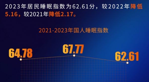 调查发现,过去一年人们虽“早睡早起”,但并未让睡眠质量得到实质改善。2023年居民平均入睡时间为23:14,平均起床时间为7:15,入睡时间较2022年提前近半个小时,八点以前起床人群占比为74.5%,高于2022与2021年所占比例。然而,2023年居民睡眠指数为62.61分,较2022年降低了5.16,较2021年降低了2.17;睡眠质量指标变化幅度更大,相比2022年下降了7.51分,相比2021年下降4.8分,均为近三年来最低。