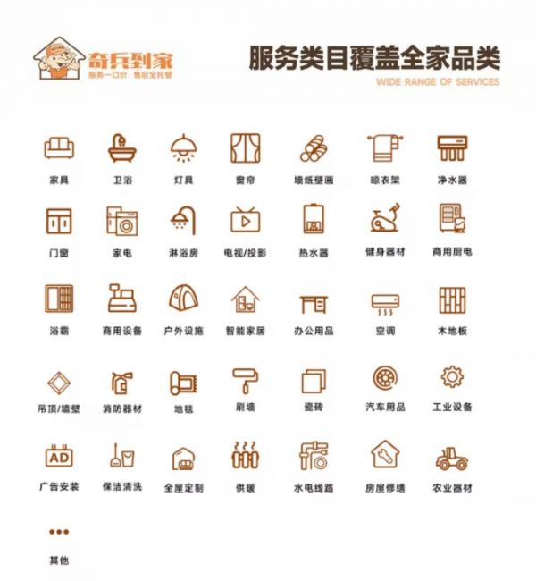 不管是客厅的电视柜、灯具,卧室的衣柜、床架,还是厨房的橱柜、水槽,亦或是卫生间的卫浴柜、智能马桶,奇兵到家的服务类目覆盖全家居品类。无论是常规家具的组装,还是特殊尺寸定制家具的安装,甚至是智能家居设备的调试,平台都能提供适配的安装服务,家具商家也无需再为不同家具找不同安装团队,一站式满足你的所有家居安装需求。
